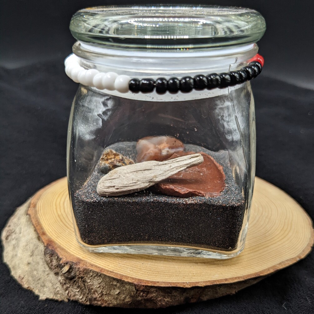 Each jar is adorned with Beadwork representing the 4 colors of the medicine wheel. In Ojibwe teachings these colors are sacred and represent the stages of life that we all experience.