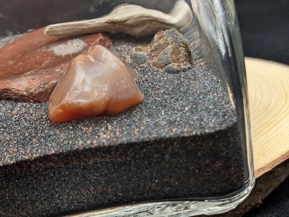 1 Glass Jar filled with Black Sand, Stone, and Driftwood all from Lake Superior