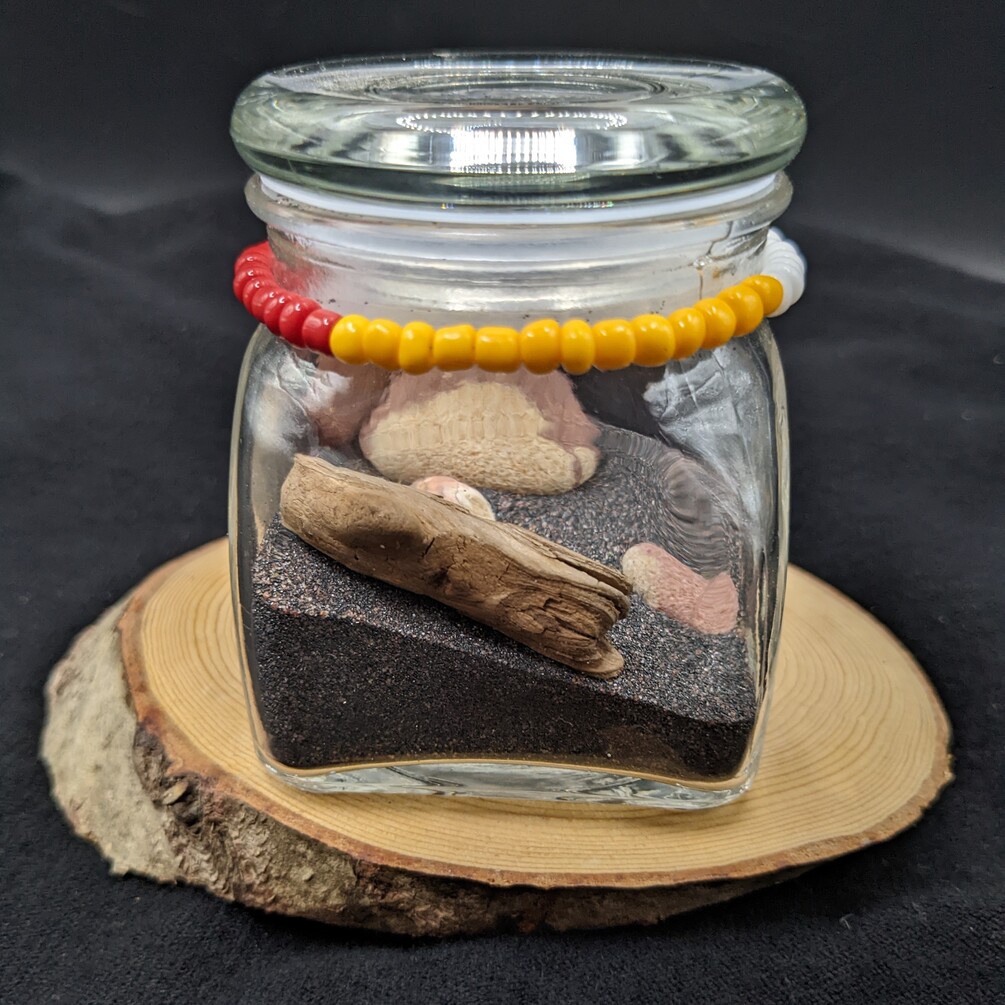 Each jar is adorned with Beadwork representing the 4 colors of the medicine wheel. In Ojibwe teachings these colors are sacred and represent the stages of life that we all experience.